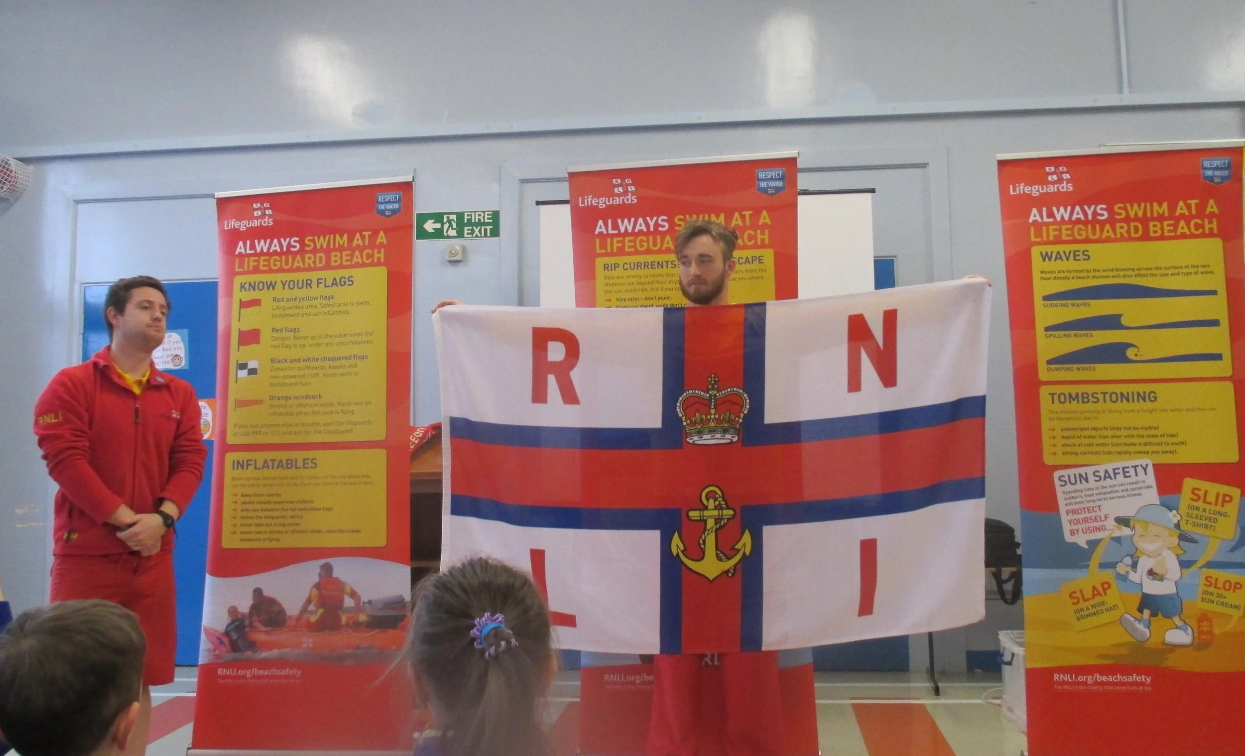 On Wednesday 22nd February we had a visit from the RNLI - Royal National Lifeboat Institution. Two lifeguards, Ray and Jamie came along to our assembly to talk to us about keeping safe at the beach. They showed the children the different flags that they might see when they go to the beach. The red and yellow flag indicates that there are lifeguards on duty and so it is safe to swim between the two flags. Red is for danger and black and white flags show that only surfers or people with kayaks should go into the sea. They also talked about the dangers of using inflatables in the sea. Andrew and Jodie were chosen to dress up as lifeguards. They were great models!